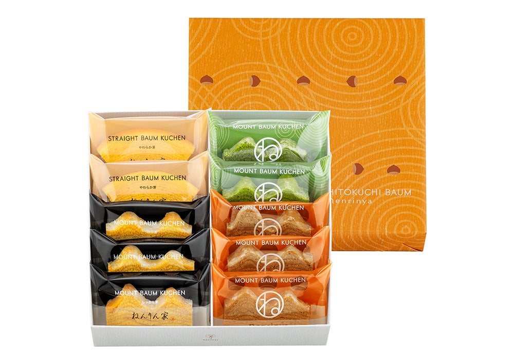 ねんりん家のバームクーヘンを 上品なひとくちサイズで⼀度に楽しめるセットです。芳醇なバター⾵味がたまらない代表作「マウントバーム しっかり芽」に芳醇なマロン香る秋限定「マウントバーム モンブラン」、芳醇宇治抹茶⾹る「マウントバーム お抹茶」、たまごたっぷりにふっくら焼きあげた「ストレートバーム やわらか芽」。